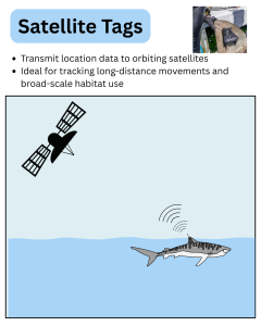 Satellite tags are used to track broad-scale movements of juvenile sharks and pregnant females across coastal and offshore environments. These tags provide near-real-time location data, allowing us to follow shark movements as they occur and identify long-distance migrations, dispersal pathways, and connectivity between offshore habitats and coastal nursery areas. In addition to location information, satellite tags can also record environmental data such as water temperature and depth, giving insight into physical conditions in different shark habitats.