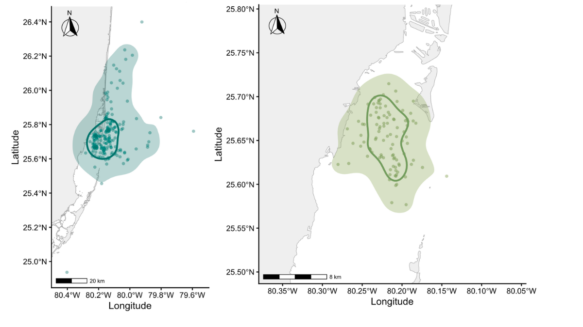 Satellite tags deployed on juvenile sharks in Biscayne Bay allow us to map movements across coastal habitats, showing where individuals spend time and how they use space over weeks to months. Points represent satellite location estimates, while the shaded areas depict overall home-range use and core activity areas from these data. This type of information helps identify important habitats and patterns of space use.